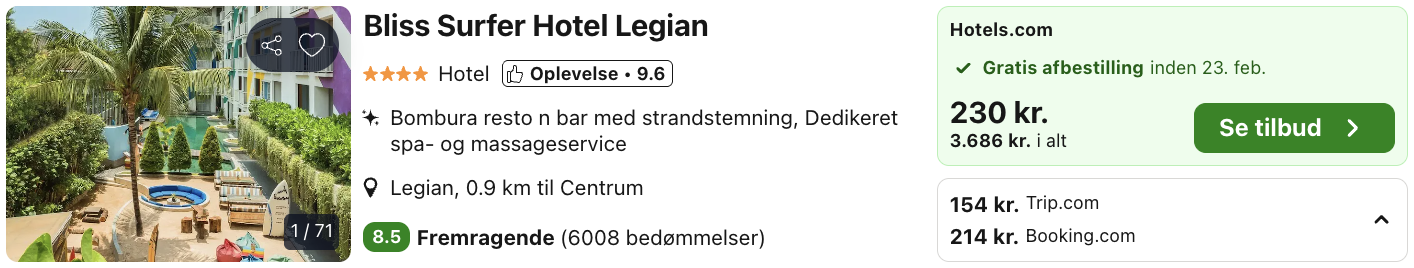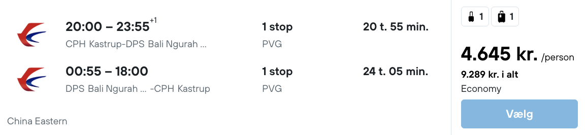 Flyet afgår fra København den 9. marts og lander på Bali den 10. marts. Dette er der taget højde for i hotelovernatning. Rejs365 er ikke et rejsebureau, men en rejseside, der finder gode tilbud! – Vi modtager kommission, men det påvirker ikke din pris! Læs mere her |