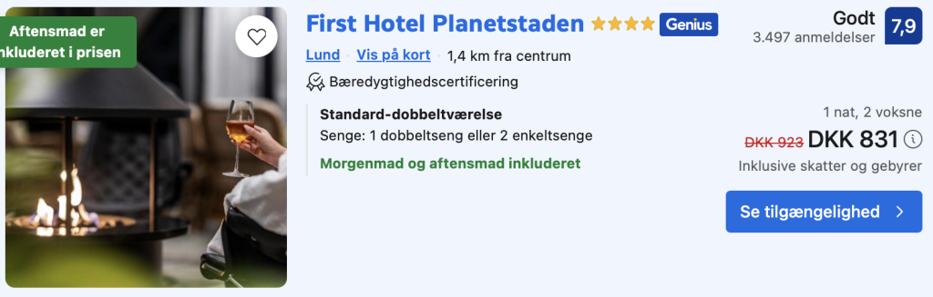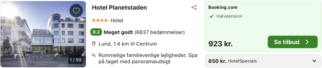 Bemærk: Prisen for opholdet er 831,- for 2 personer i et dobbeltværelse, hvilket svarer til 416,- per person. Entré til First Hotel Planetstaden spaafdeling købes direkte hos hotellet og koster 295 SEK (209,- DKK) per person. Rejs365 er ikke et rejsebureau, men en rejseside, der finder gode tilbud! – Vi modtager kommission, men det påvirker ikke din pris! Læs mere her