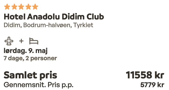 Hvis rejsen er med “Vis fly” og “Vis hotel” link, så er der tale om en sammensat rejse. Det vil sige at fly og hotel skal bestilles hver for sig. Prisen vi angiver vil dog være samlet for fly og hotel med mindre andet er angivet.