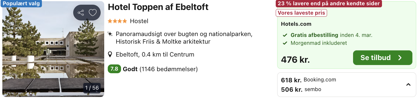 Bemærk: Den samlede pris for opholdet er 476,- for 2 personer i et dobbeltværelse hvilket svarer til 238,- per person.