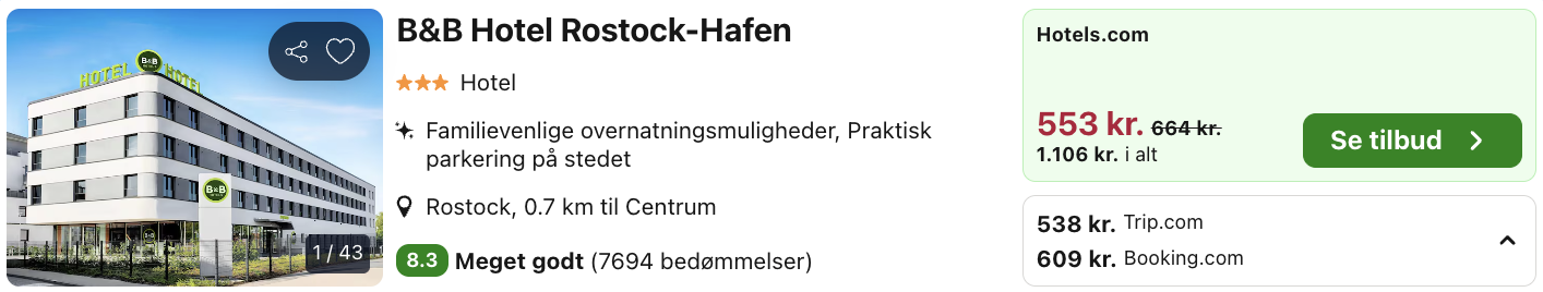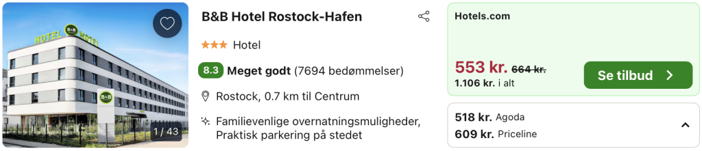 Bemærk: Den samlede pris for opholdet er 1.076,- for 2 personer i et dobbeltværelse, hvilket svarer til 538,- per person. Der kan være mindre prisforskelle på mobil og pc. Undersøg derfor med fordel, hvor det er billigst for at opnå den bedste pris. Rejs365 er ikke et rejsebureau, men en rejseside, der finder gode tilbud! – Vi modtager kommission, men det påvirker ikke din pris! Læs mere her |
