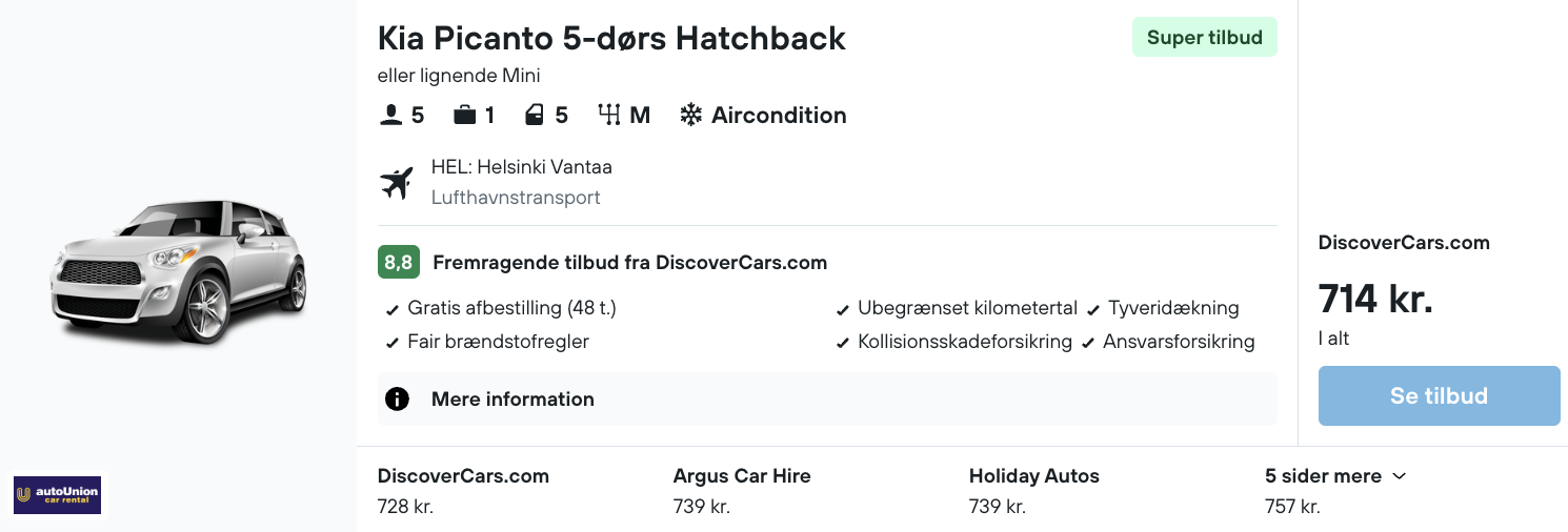 Den samlede pris for leje af bil er 714,- hvilket svarer til 357,- per person ved 2 personer.