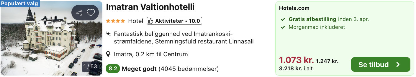 Imatran Valtionhotelli er et hotel, der oser af historie og charme midt i Imatra i det sydøstlige Finland. Hotellet er indrettet i en smuk jugendstilbygning fra begyndelsen af 1900-tallet og har en eventyrlig atmosfære, der får gæsterne til at føle, at de er trådt ind i en anden tid. Den majestætiske arkitektur, de detaljerede facadeudsmykninger og de klassiske interiører skaber en helt særlig oplevelse.