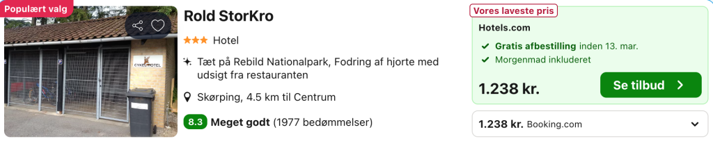 Rold Storkro ligger midt i den smukke Rold Skov og skaber en stemningsfuld ramme for et ophold, hvor naturen virkelig får lov at fylde. Hotellet har en hyggelig og klassisk dansk atmosfære med varme farver, gode materialer og den afslappede ro, som området er kendt for. Værelserne er enkle og behagelige, mange med udsigt til skovens grønne omgivelser, så man vågner med fornemmelsen af at være helt tæt på naturen.
