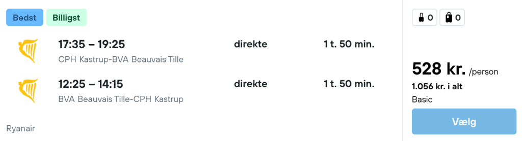 Tjek altid datoerne for at se om de passer sammen før du bestiller, da vi kan have begået fejl. Tjek derudover også prisen på begge ting før du bestiller det ene, da prisen kan have ændret sig. Der kan også være små variationer i prisen mellem mobil og pc.