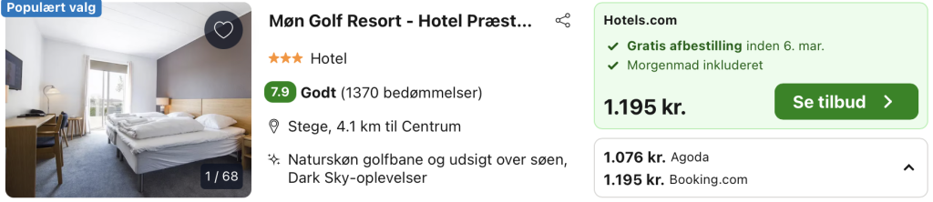 Vi har taget udgangspunkt i et ophold fra den 8. – 9. marts på Møn Golf Resort – Hotel Præstekilde, der ligger i naturskønne omgivelser på det vestlige Møn, omgivet af åbne marker, skov og resortets egen golfbane. Hotellet har en rolig og afslappet atmosfære med lyse værelser indrettet i enkel, nordisk stil, hvor komfort og udsigt til naturen er i fokus. Stemningen er uformel og indbydende, hvilket gør stedet velegnet til både golfophold, par og gæster, der ønsker fred og natur tæt på.