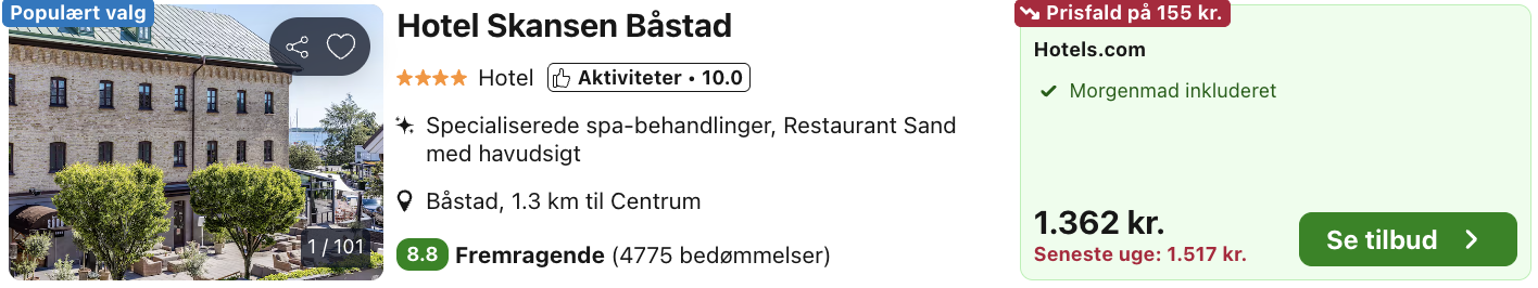 Bemærk: Den samlede pris for overnatningen er 1.362,- for 2 personer i et dobbeltværelse med morgenmad, hvilket svarer til 681,- per person Adgang til spa, fitness og rooftop koster 399 SEK per person, hvilket svarer til 272 danske kroner og bestilles direkte hos hotellet. Rejs365 er ikke et rejsebureau, men en rejseside, der finder gode tilbud! – Vi modtager kommission, men det påvirker ikke din pris! Læs mere her |
