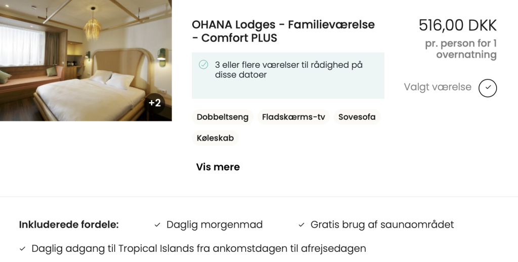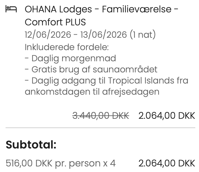 | Bemærk: Den samlede pris for overnatningen er 2.064,- for 4 personer i et OHANA Lodges – Familieværelse – Comfort PLUS, hvilket svarer til 516,- per person. |