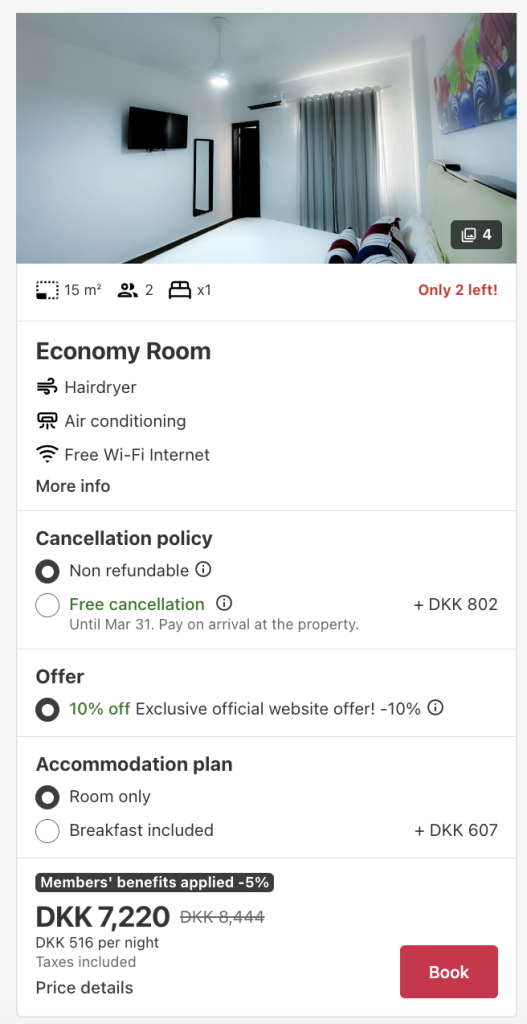| Bemærk: Hotellet koster 7.220,- for to personer, hvilket svarer til 3.610,- per person. |
