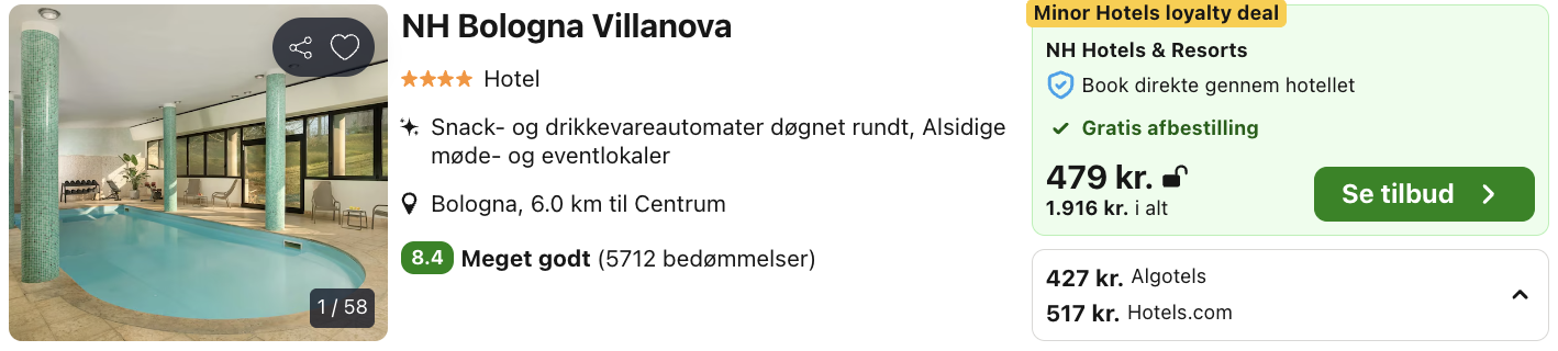 Bemærk: Den samlede pris for hotellet er 1.709,- for 2 personer i et dobbeltværelse, hvilket svarer til 855,- per person.