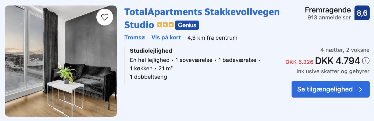 TotalApartments – Stakkevollvegen studio i Tromsø er et moderne og enkelt sted at bo i byen. Lejlighederne ligger på Stakkevollvegen 303 i et område med god forbindelse til både centrum og naturattraktioner omkring Tromsø. Hver lejlighed er fuldt møbleret med eget badeværelse, en komplet køkkenløsning med køleskab, komfur, ovn og opvaskemaskine samt vaskemaskine, så du kan klare både madlavning og tøjvask under dit ophold. Bygningen har vinduer fra gulv til loft, der giver et lyst og urbant udtryk, og der er gratis wifi i alle enheder.