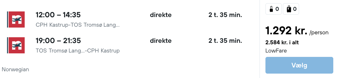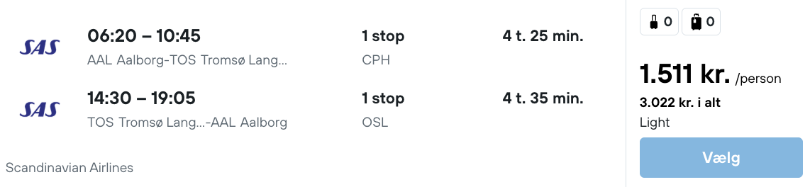 På vores flysøgemaskine har vi fundet billige flybilletter fra København og Aalborg til Tromsø: