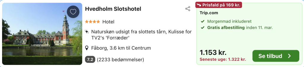 Ophold på smukke Hvedholm Slot for kun 577,- per person inkl. morgenmad!
