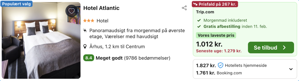 Bemærk: Den samlede pris for opholdet er 1.012,- for 2 personer i et dobbeltværelse, hvilket svarer til 506,- per person. Der kan være mindre prisforskelle på mobil og pc. Undersøg med fordel, hvor det er billigst inden bestilling.