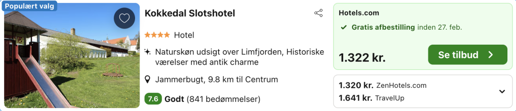 Kokkedal Slotshotel ligger kun 30 min fra Aalborg midt i idyllisk natur mellem Limfjorden og Vesterhavet. Slottet er oprindeligt en vandborg fra middelalderen, opført på et fæstningsanlæg fra vikingetiden.