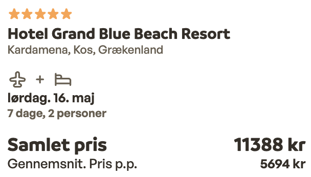 Hvis rejsen er med “Vis fly” og “Vis hotel” link, så er der tale om en sammensat rejse. Det vil sige at fly og hotel skal bestilles hver for sig. Prisen vi angiver vil dog være samlet for fly og hotel med mindre andet er angivet.