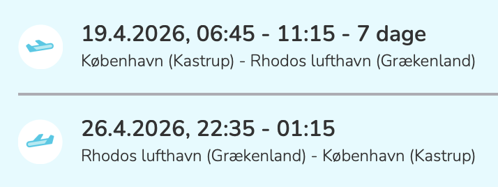 Hvis rejsen er med “Vis fly” og “Vis hotel” link, så er der tale om en sammensat rejse. Det vil sige at fly og hotel skal bestilles hver for sig. Prisen vi angiver vil dog være samlet for fly og hotel med mindre andet er angivet.