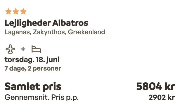 Hvis rejsen er med “Vis fly” og “Vis hotel” link, så er der tale om en sammensat rejse. Det vil sige at fly og hotel skal bestilles hver for sig. Prisen vi angiver vil dog være samlet for fly og hotel med mindre andet er angivet.