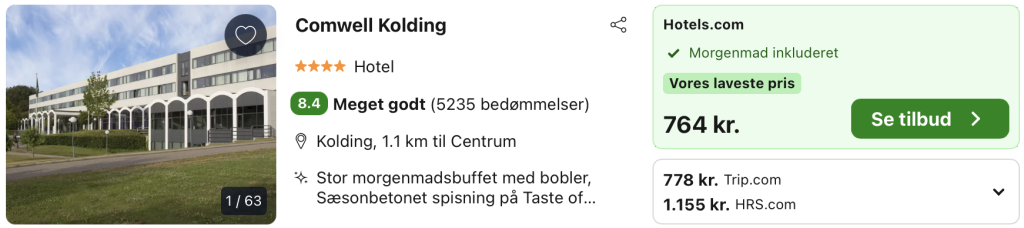 Vi har taget udgangspunkt i et ophold fra den 28. februar – 1. marts på 4-stjernede Comwell Kolding, der ligger omgivet af smuk natur med et stort udvalg af kulturelle aktiviteter og muligheder for fysiske aktiviteter i nærheden. Det gør et ophold på Comwell Kolding perfekt til par såvel som familier.