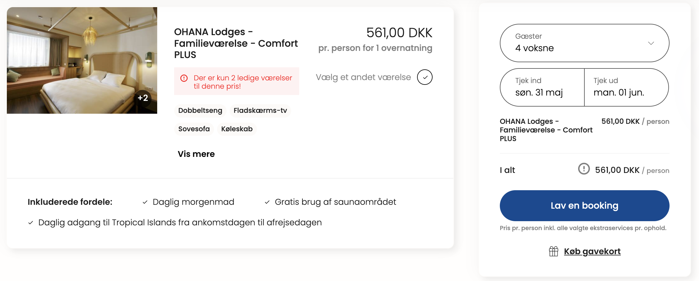 | Bemærk: Den samlede pris for overnatningen er 2.244,- for 4 personer i et OHANA Lodges – Familieværelse – Comfort PLUS, hvilket svarer til 561,- per person. |