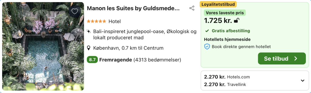 5-stjernede luksushotel Manon Les Suites fra Guldsmeden Hotels ligger midt i København, men leder straks dine tanker hen på eksotisk drømmeferie på Bali. Her får du et bæredygtigt luksusophold med boheme-luksus, betagende design og en festlig atmosfære samt fremragende mad, drikkevarer og service.