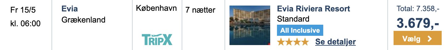 På Travelmarket har vi hos Tripx, Primo Tours og SunCharter fundet gode tilbud fra København, Billund og Aalborg til Evia: