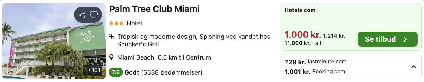 F.eks. 12 dage ved Miami for kun 6.700,- per person inkl. fly og godt 3-stjernet hotel med pool og god beliggenhed!