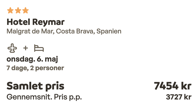 Hvis rejsen er med “Vis fly” og “Vis hotel” link, så er der tale om en sammensat rejse. Det vil sige at fly og hotel skal bestilles hver for sig. Prisen vi angiver vil dog være samlet for fly og hotel med mindre andet er angivet.