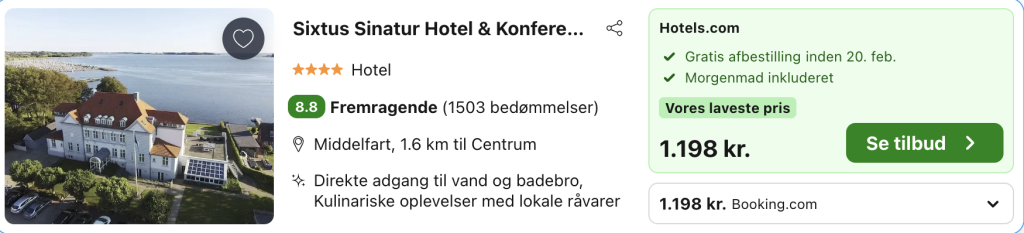 Bemærk: Den samlede pris for opholdet er 1.198,- for 2 personer i et dobbeltværelse, hvilket svarer til 584,- per person. Rejs365 er ikke et rejsebureau, men en rejseside, der finder gode tilbud! – Vi modtager kommission, men det påvirker ikke din pris! Læs mere her |