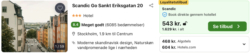 Scandic Go Sankt Eriksgatan 20 ligger centralt i Stockholm i bydelen Kungsholmen, tæt på både Vasastan og byens vigtigste knudepunkter. Hotellet er indrettet i Scandic Go-konceptets moderne og minimalistiske stil med kompakte, funktionelle værelser, hvor fokus er på komfort, gode senge og en effektiv indretning. Stemningen er urban og afslappet, perfekt til storbyrejsende, der ønsker en smart og prisvenlig base midt i byen.