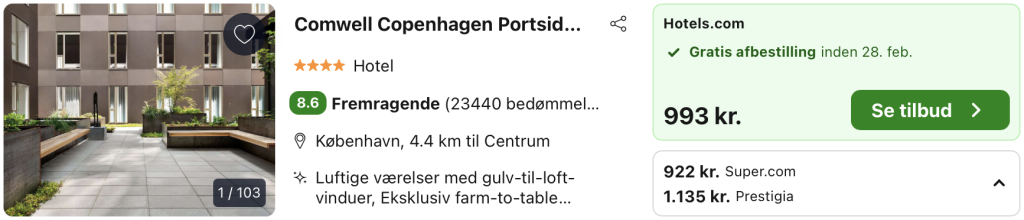 Vi har taget udgangspunkt i et ophold fra den 28. februar – 1. marts på Comwell Copenhagen, der er et moderne hotel beliggende tæt på centrum af København, hvor byens puls møder en afslappet atmosfære. Hotellet er kendt for sin skandinaviske indretning, lyse rum og en stil, der kombinerer funktionalitet med elegance. Her får man en oplevelse, der både henvender sig til forretningsrejsende, som søger et professionelt miljø, og til dem, der ønsker at nyde en weekend i hovedstaden med komfort og god service.