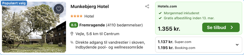 Munkebjerg Hotel er en elegant perle beliggende midt i naturskønne omgivelser ved Vejle Fjord. Hotellet er kendt for sin unikke placering omgivet af skov og med udsigt over vandet, hvilket gør det til en ideel destination for dem, der søger afslapning, forkælelse og smukke omgivelser.