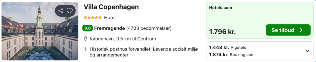 Oplev et femstjernet og afslappende ophold på Danmarks nye luksuriøse hotel Villa Copenhagen. Bygningen har bibeholdt sin ikoniske arkitektur på ydersiden, men har gennemgået en total renovering indvendigt. Hotellet har 390 værelser og er beliggende i hjertet af København med Tivoli, Hovedbanegården og Strøget indenfor få minutters gang.