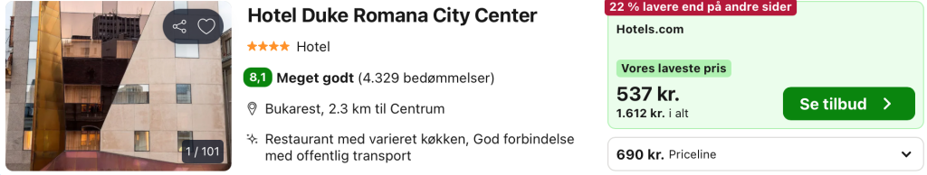 | Bemærk: Den samlede pris for hotellet er 1.612,- for to personer i et dobbeltværelse, hvilket svarer til 806,- per person. |