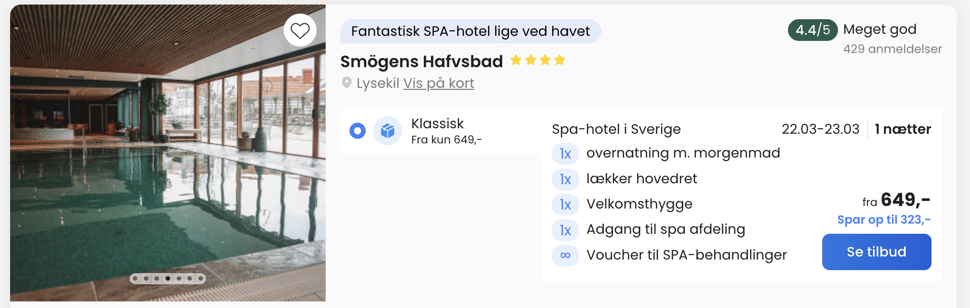 Vi har taget udgangspunkt i et ophold fra den 22. – 23. marts, men der er mange andre datoer i 2026 på Smögens Hafvsbad til gode priser.