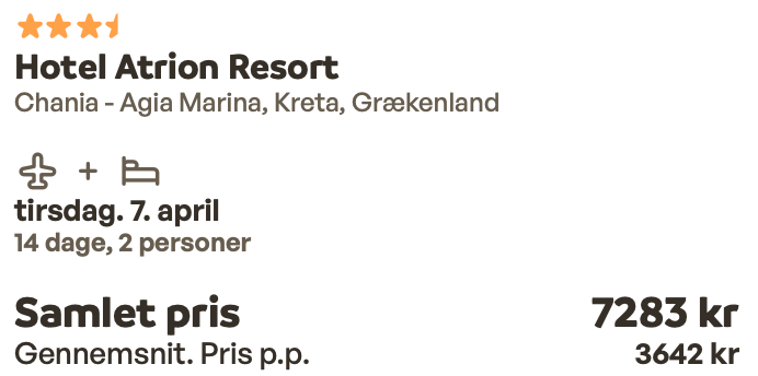 Hvis rejsen er med “Vis fly” og “Vis hotel” link, så er der tale om en sammensat rejse. Det vil sige at fly og hotel skal bestilles hver for sig. Prisen vi angiver vil dog være samlet for fly og hotel med mindre andet er angivet.