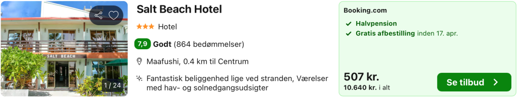Salt Beach Hotel Maldiverne ligger i rolige og autentiske omgivelser på en lokal ø i Maldiverne, direkte ud til den hvide sandstrand og det krystalklare hav. Hotellet har en afslappet og moderne stil med fokus på nærhed til naturen og den lokale kultur. Værelserne er lyst indrettede med komfortable senge, aircondition og terrasse eller balkon, hvor man kan nyde havbrisen og udsigten til stranden. Stemningen er rolig og uformel, perfekt for rejsende der ønsker en mere ægte maldivisk oplevelse frem for store luksusresorts.