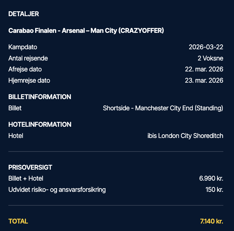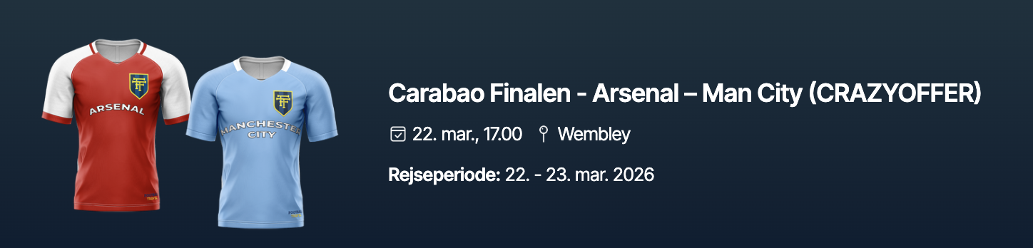 Du bestiller din fodboldrejse hos Footballtravel.dk. Vi har taget udgangspunkt i en pakke der inkluderer hotel og billet til Carabao Cup finalen mellem Arsenal og Manchester City.