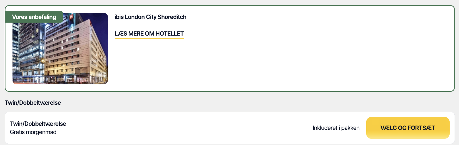 Hvis rejsen er med “Vis rejse” link, så er der tale om en pakkerejse, hvor fly og hotel bestilles på en gang.