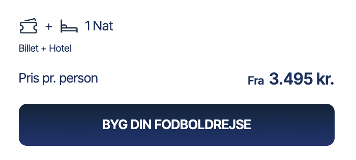 | Bemærk: Den samlede pris for billet og hotel er 7.140,- for 2 personer i et dobbeltværelse, hvilket svarer til 3.570,- per person inkl. udvidet risiko- og ansvarsforsikring. |