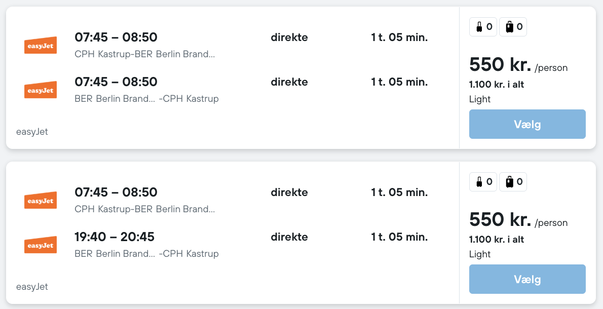 Bemærk: Husk at lade søgningen på vores flysøgemaskine blive helt færdig. Der kan være mindre forskelle på priser på mobil og pc. Undersøg med fordel, hvor det er billigst inden bestilling.