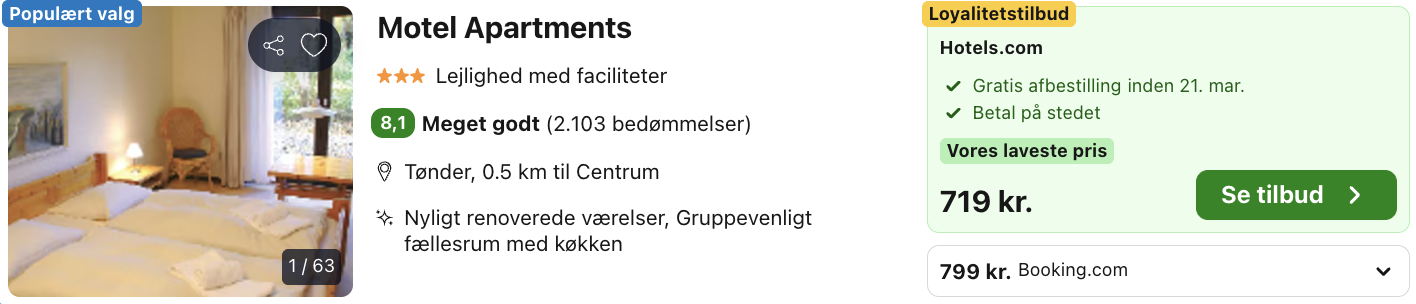 | Bemærk: Hotellet koster 719,- for to personer i et dobbeltværelse, hvilket svarer til 360,- per person. Husk at vælge den billigste pris.