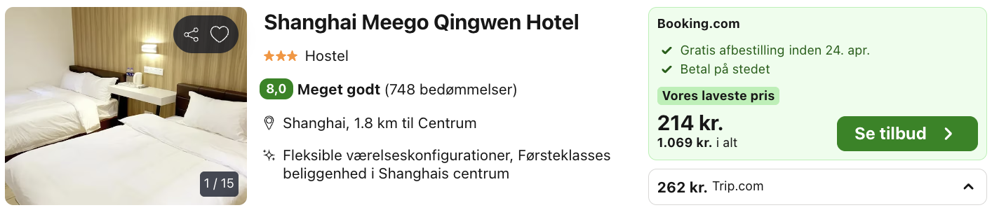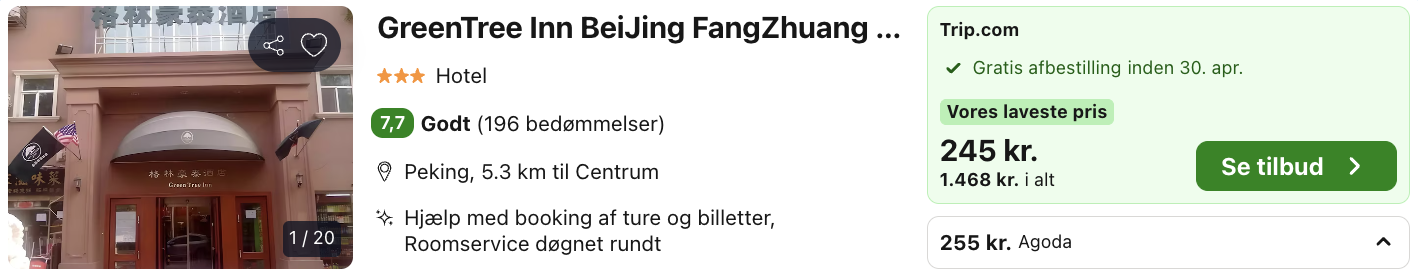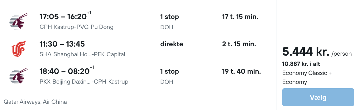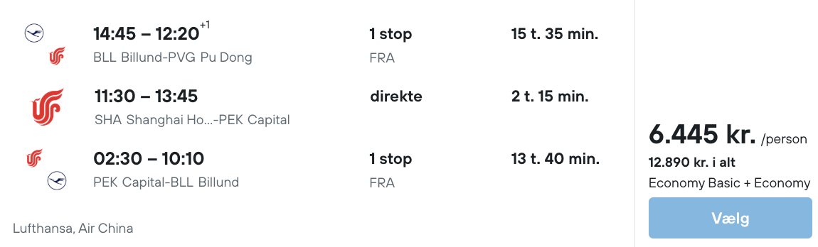 Flyrejsen er samlet i en flybillet. 1. fly: København – Shanghai 24. april (ankomst 25. april) Hotel i Shanghai: Her er den samlede pris for hotellet er 1.069,- for 2 personer i et dobbeltværelse, hvilket er 535,- per person. 2. fly: Shanghai – Beijing 30. april Hotel i Beijing: Her er den samlede pris for hotellet er 1.468,- for 2 personer i et dobbeltværelse, hvilket er 734,- per person. 3. fly = Beijing – København 6. maj (ankomst 6. maj) Vær opmærksom på at flyet fra Beijing til København afgår natten mellem den 5. og 6. maj. |