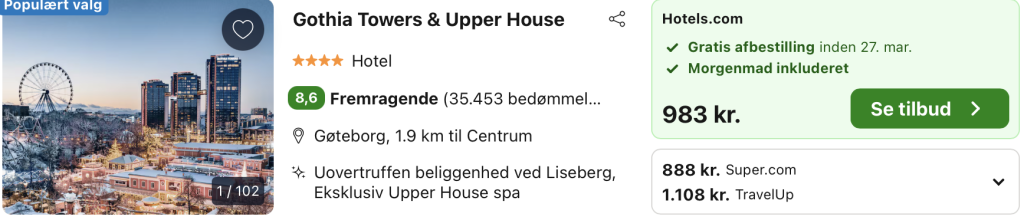 Vi har taget udgangspunkt i et ophold fra den 29. – 30. marts på Gothia Towers & Upper House, der er ikoniske vartegn i Göteborg, der tilsammen udgør en enestående oplevelse for besøgende. Upper House er en eksklusiv del af Gothia Towers, der tilbyder enestående luksus og en særlig følelse af forkælelse. Hotellet ligger på de øverste etager og byder på imponerende udsigt over byen. Med store, elegante værelser og en prisbelønnet spa med en spektakulær udendørs glasbundspool hævet over byen, er det et sted, hvor afslapning når nye højder.