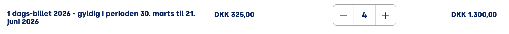 Vi har taget udgangspunkt i en dagsbillet til 325,- per. person fra 3-64 år. Billetten giver fri adgang til alle forlystelser. Der er flere andre billetkategorier. Børn 0-2 år er gratis.