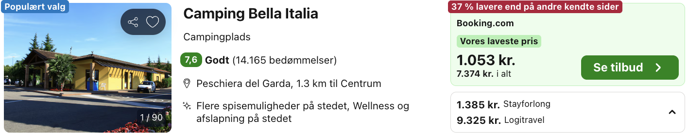 Bemærk: Den samlede pris for hotellet/campingpladsen er 7.374,- for 4 personer, hvilket svarer til 1.844,- per person.