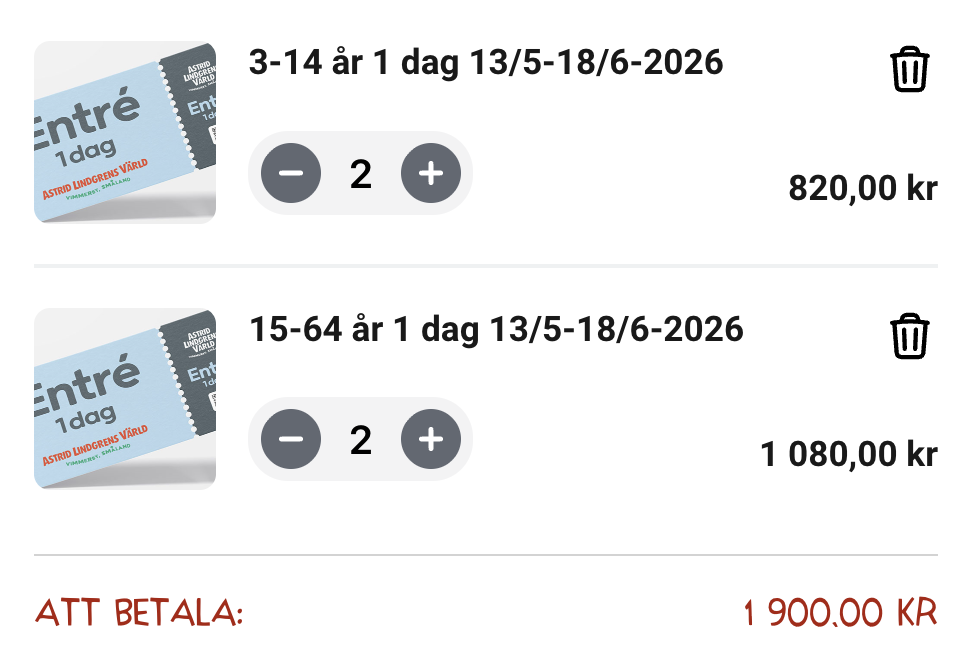 Entré til Astrid Lindgrens Verden købes direkte hos parken og koster i alt 1.900- SEK. (1.330,- DKK) for 2 voksne og 2 børn, hvilket svarer til 333,- DKK per person. |