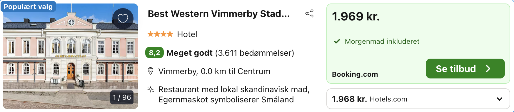 Bemærk: Den samlede pris for hotellet er 1.968,- for 4 personer, hvilket svarer til 492,- per person. Entré til Astrid Lindgrens Verden købes direkte hos parken og koster i alt 1.900- SEK. (1.330,- DKK) for 2 voksne og 2 børn, hvilket svarer til 333,- DKK per person. Rejs365 er ikke et rejsebureau, men en rejseside, der finder gode tilbud! – Vi modtager kommission, men det påvirker ikke din pris! Læs mere her