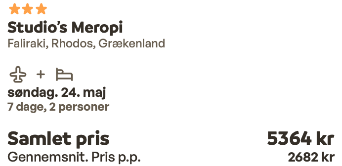 Hvis rejsen er med “Vis fly” og “Vis hotel” link, så er der tale om en sammensat rejse. Det vil sige at fly og hotel skal bestilles hver for sig. Prisen vi angiver vil dog være samlet for fly og hotel med mindre andet er angivet.