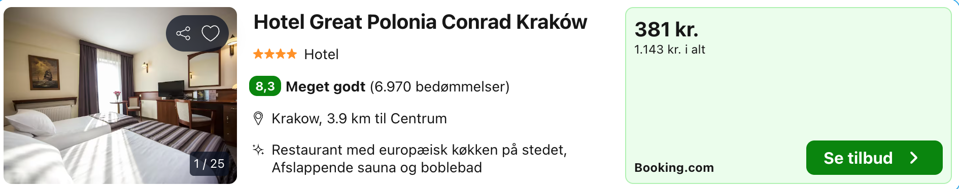 | Bemærk: Den samlede pris for hotellet er 1.143,- for 2 personer, hvilket svarer til 572,- per person. |